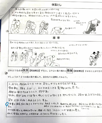 ユニットの前半は、1年次に取り扱った投げ技「体落とし」「膝車」や、固め技「横四方固め」「袈裟固め」の復習です。実技の中で身につけた技を「ポイントは?」「うまく投げるコツは?」「返すコツは?」などの視点から自分の言葉で整理し、重要な概念を抽出していきます。